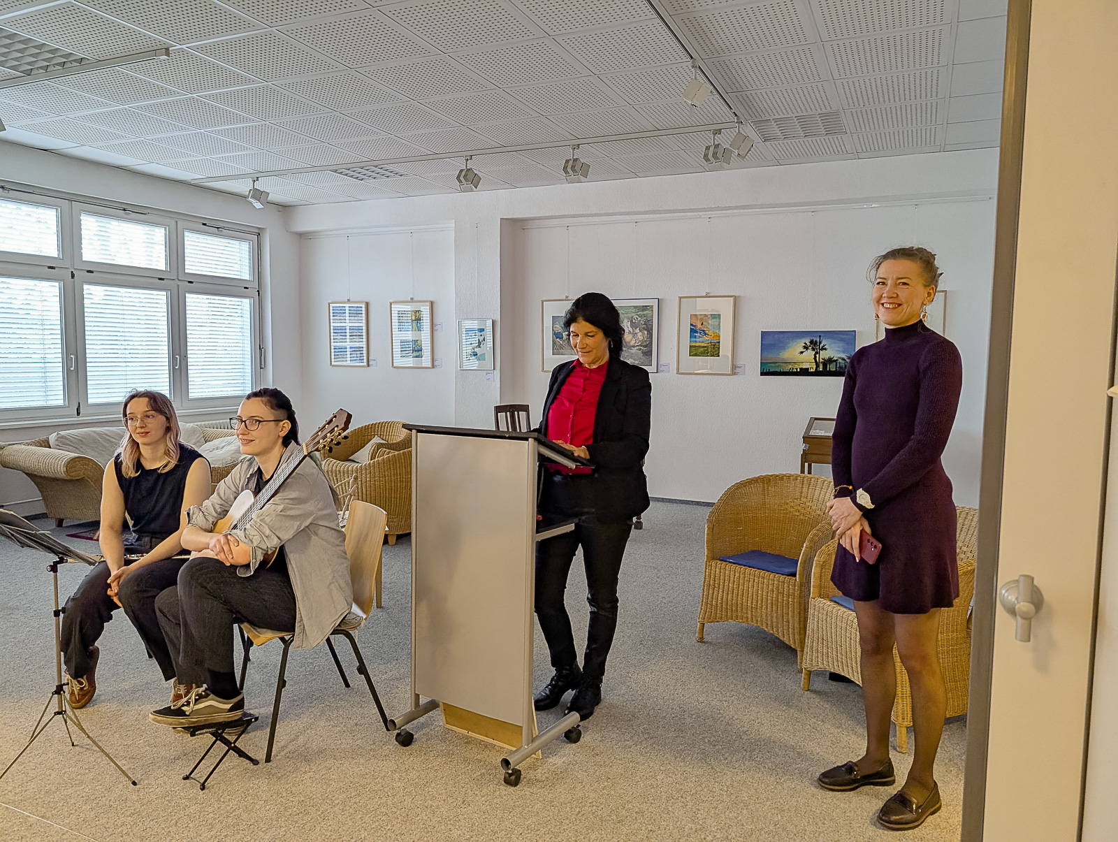 Musikalisch eröffnet wurde die Vernissage von Rosa Hädschke (Querflöte) und Tasha Spohr (Gitarre) mit einem klassischen Titel. Die feinen, klaren Klänge schufen sofort jene konzentrierte, ruhige Atmosphäre, die auch Elenas Bilder auszeichnet.