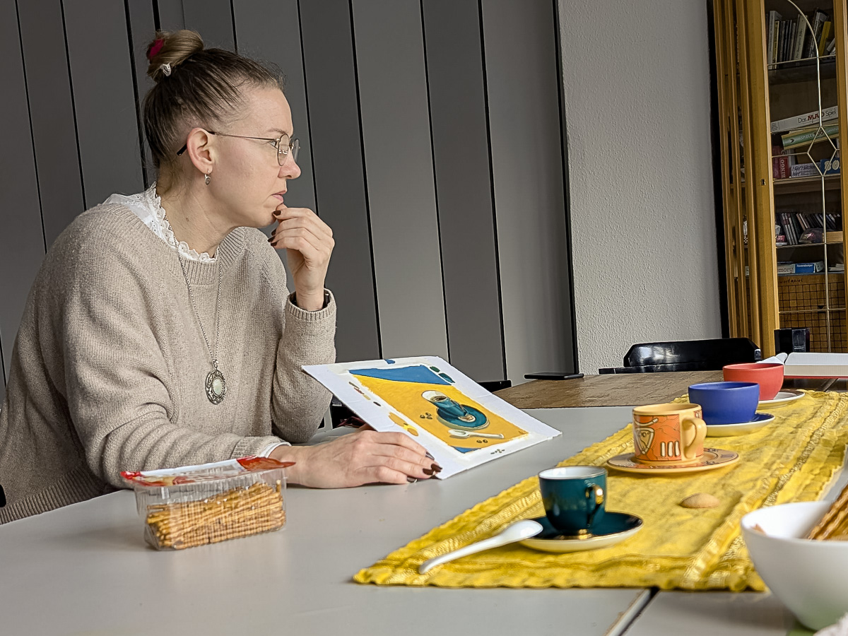 Im Mittelpunkt des Workshops stand die Lasurtechnik. Als Motiv dienten vier Tassen, die von allen Teilnehmern als Vorlage genutzt wurden. Der Einstieg begann klassisch mit einer Skizze auf festem, dünnem Papier. Mit einem einfachen Trick – weicher Bleistift auf der Rückseite – ließ sich die Zeichnung sauber auf den Malgrund übertragen.