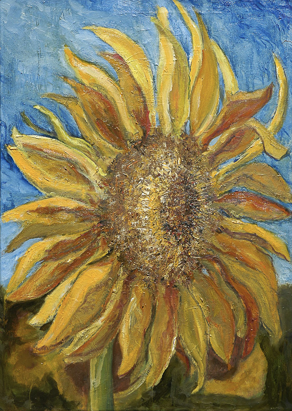 Als zentrales Motiv symbolisiert die Sonnenblume das vibrierende Spiel der Natur und den Kreislauf des Lebens. Blue Guada reiste in die Felder von Entrer Rios, um die Blumen mit allen Sinnen zu erfahren, und ließ sie sogar in ihrem eigenen Garten wachsen, um ihr Keimen, Blühen und Vergehen zu beobachten. In der Ausstellung finden sich expressive Darstellungen wie "Bunte Sonnenblumen I" (1993) und die Gemälde "Sonnenblumenfeld" (2009).