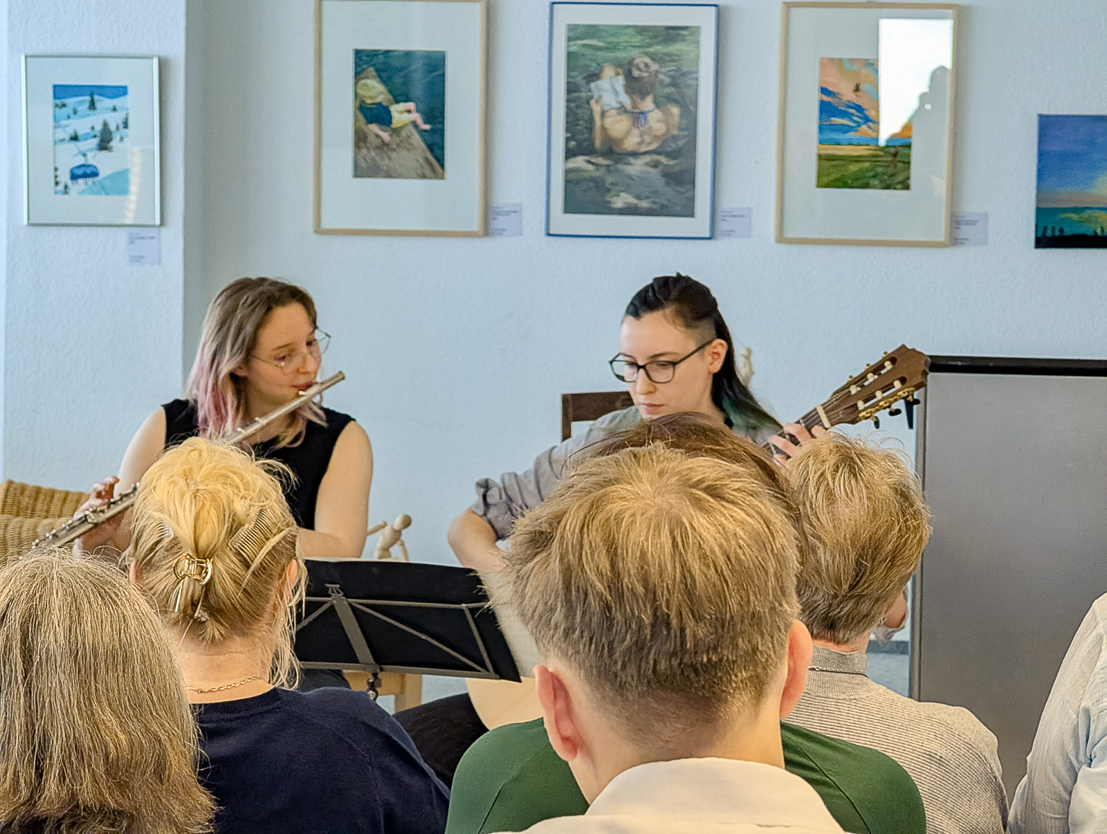 Musikalisch eröffnet wurde die Vernissage von Rosa Hädschke (Querflöte) und Tasha Spohr (Gitarre) mit einem klassischen Titel. Die feinen, klaren Klänge schufen sofort jene konzentrierte, ruhige Atmosphäre, die auch Elenas Bilder auszeichnet.