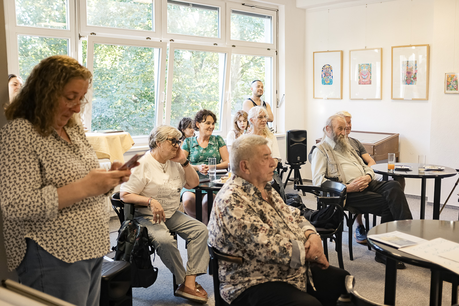 Am Ende überreichte ich Celi symbolisch einen Sonnenblumenstrauß, was sie sichtlich berührte. Danach ging die Vernissage in einen offenen Austausch über. Gäste, Künstler, Freunde – alle kamen ins Gespräch.